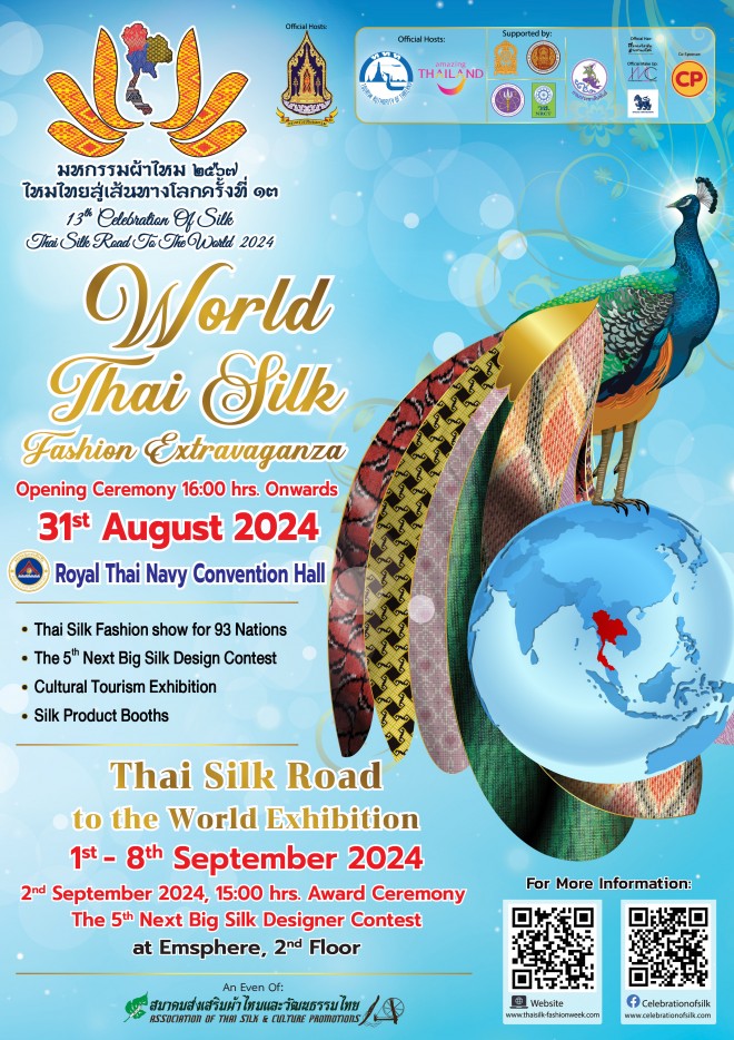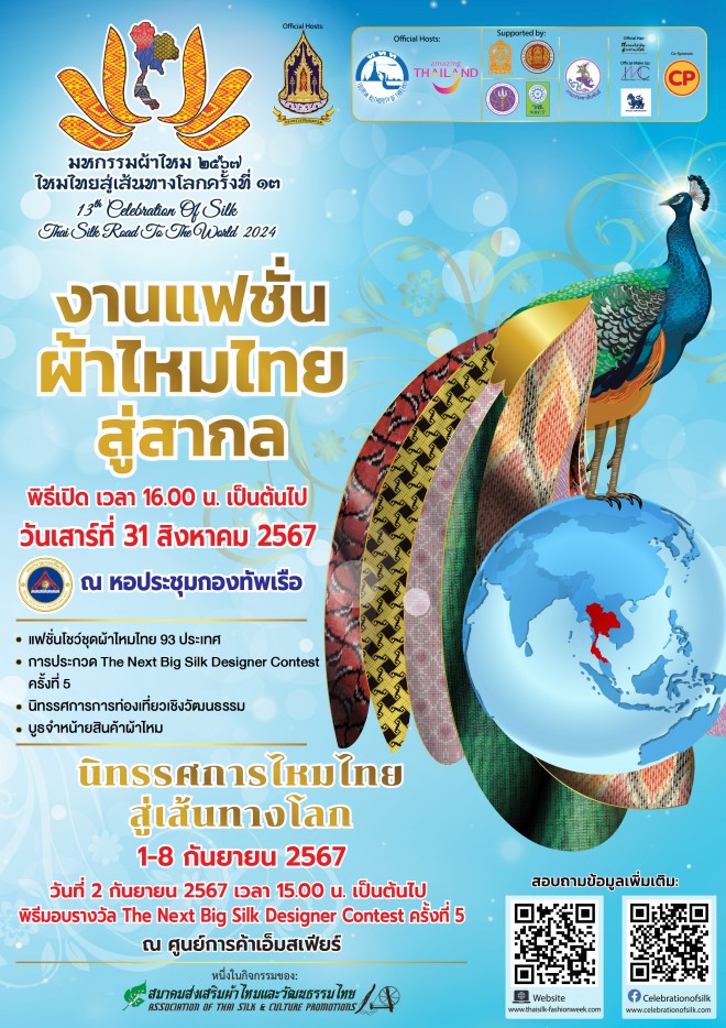 มหกรรมผ้าไหม ไหมไทยสู่เส้นทางโลก ครั้งที่ 13Poster of the 13th Celebration of Silk, Thai Silk Road To The World 2024