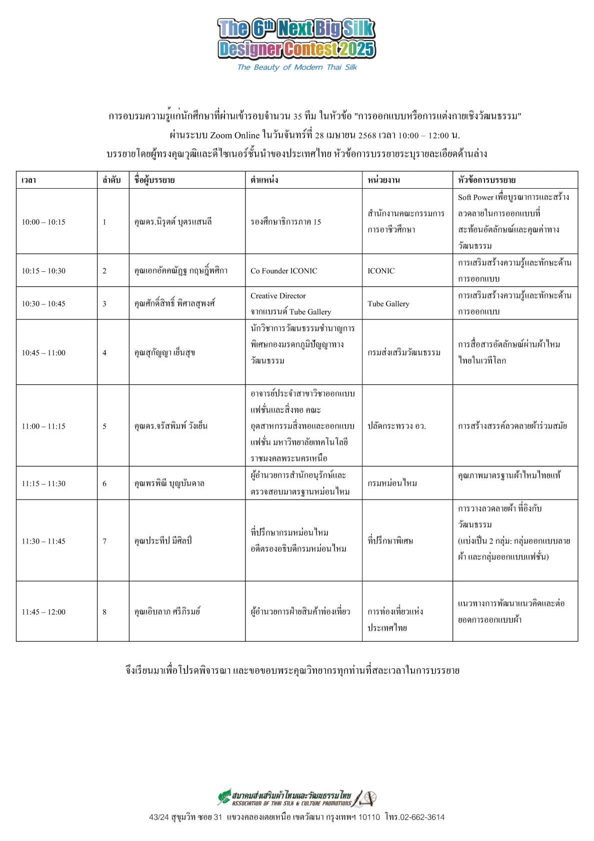 • กำหนดการอบรม สำหรับนักศึกษาที่ผ่านเข้ารอบ The Next Big Silk Designer Contest ครั้งที่ 6