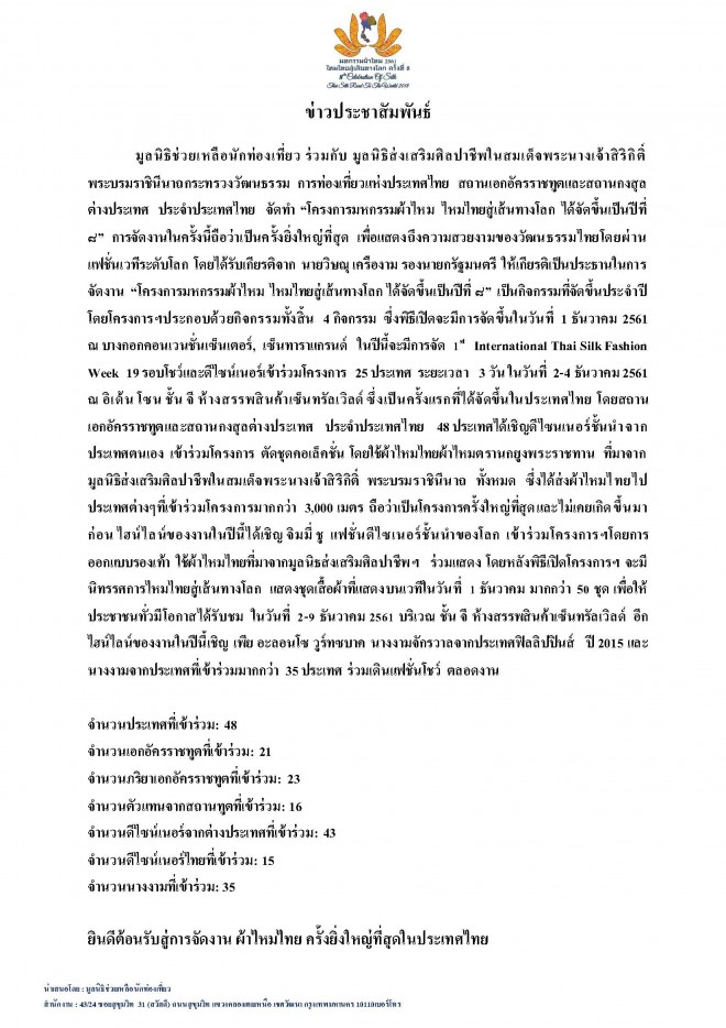 • งานวันแถลงข่าวงานมหกรรมผ้าไหม ไหมไทยสู่เส้นทางโลกครั้งที่ 14 ณ.หอศิลป์ กระทรวงวัฒนธรรม ห้อง Gallery 5