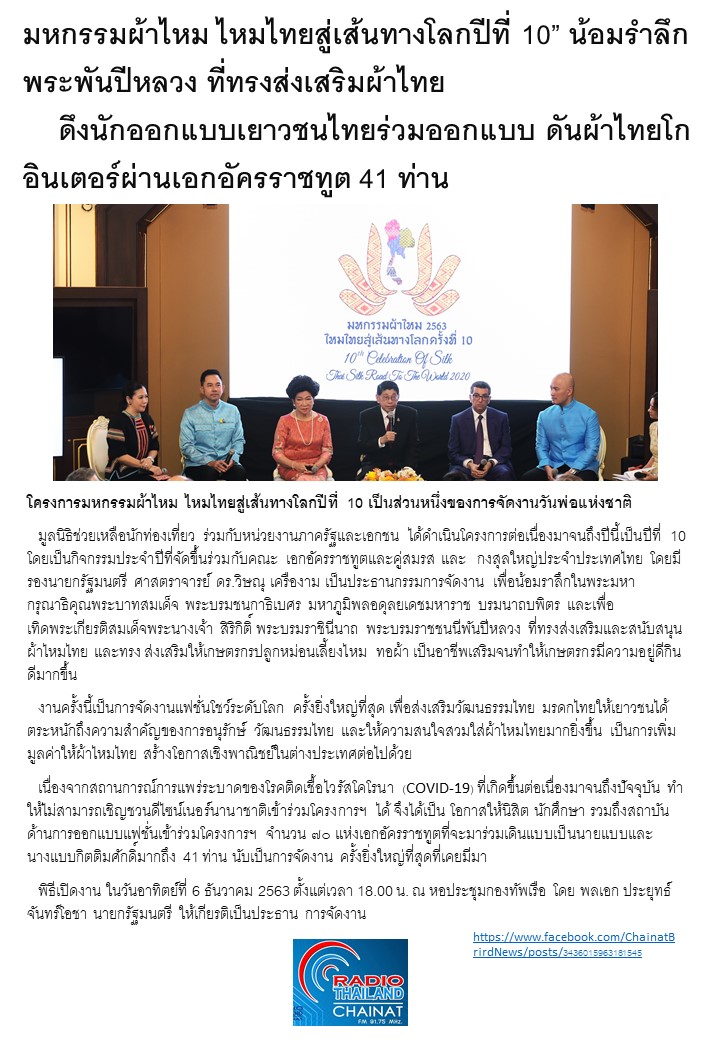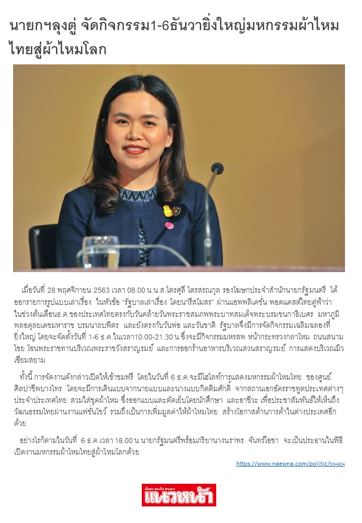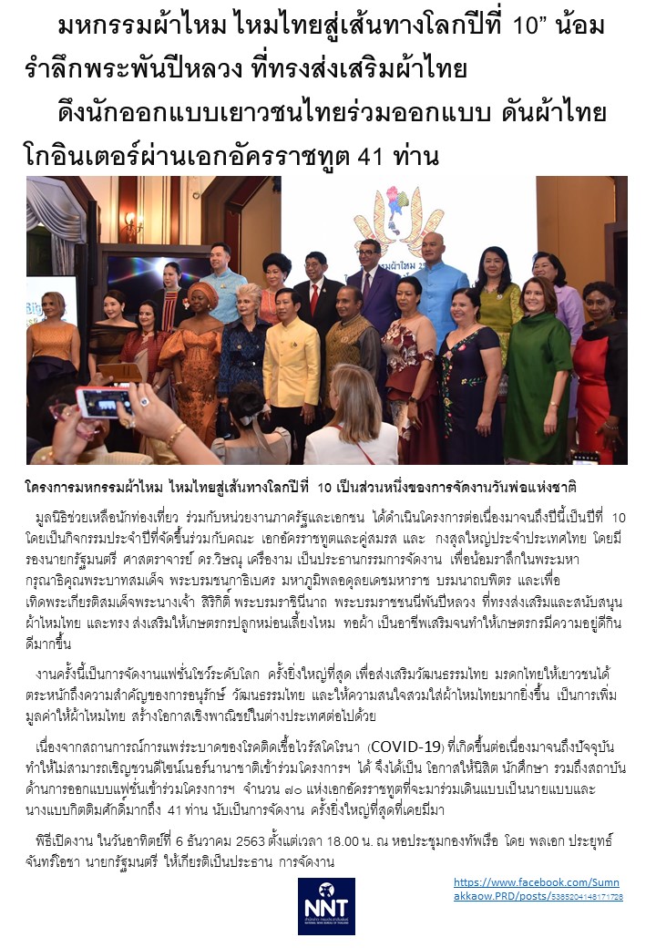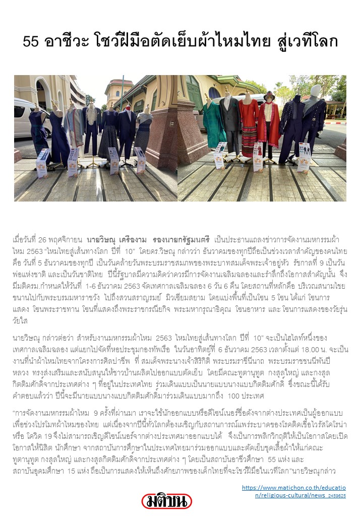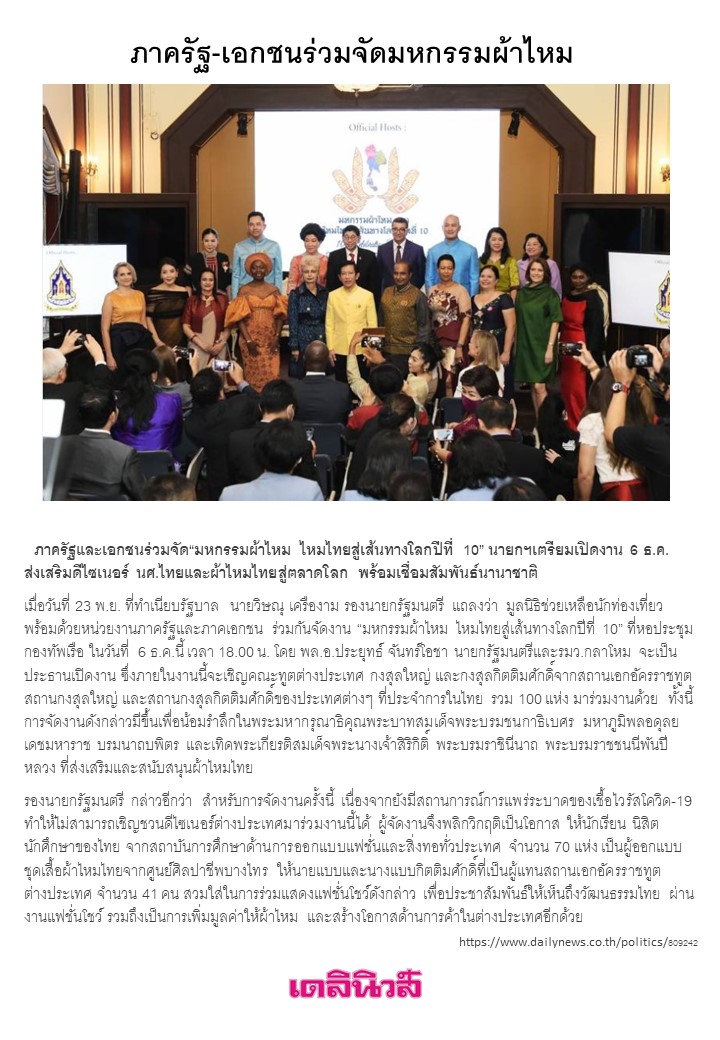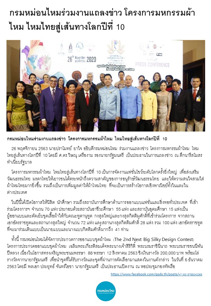 • พิธีมอบรางวัลการประกวด The 6th Next Big Silk Designer Contest โดย คุณพลอย ธนิกุล ผู้ช่วยรัฐมนตรีว่าการกระทรวงวัฒนธรรม