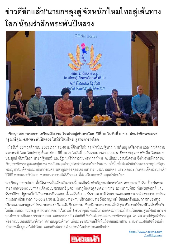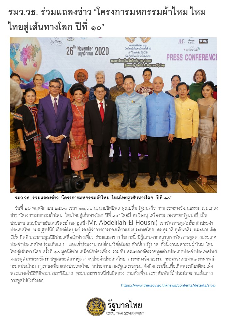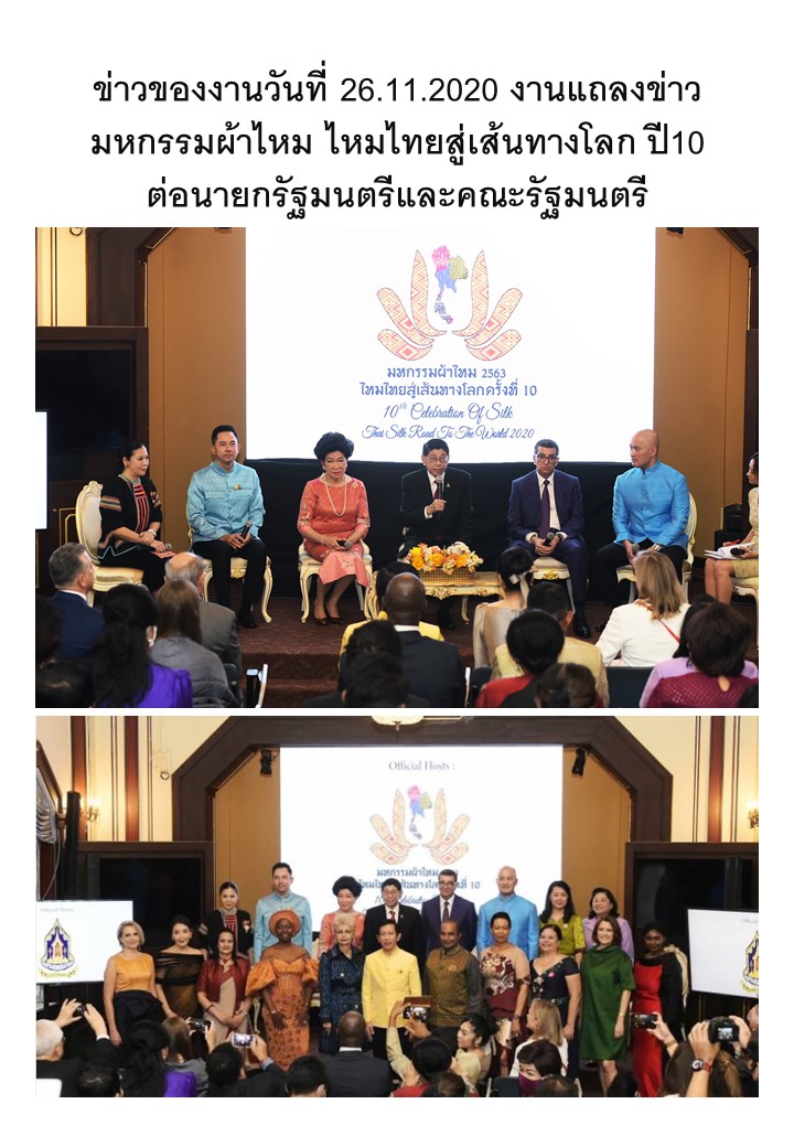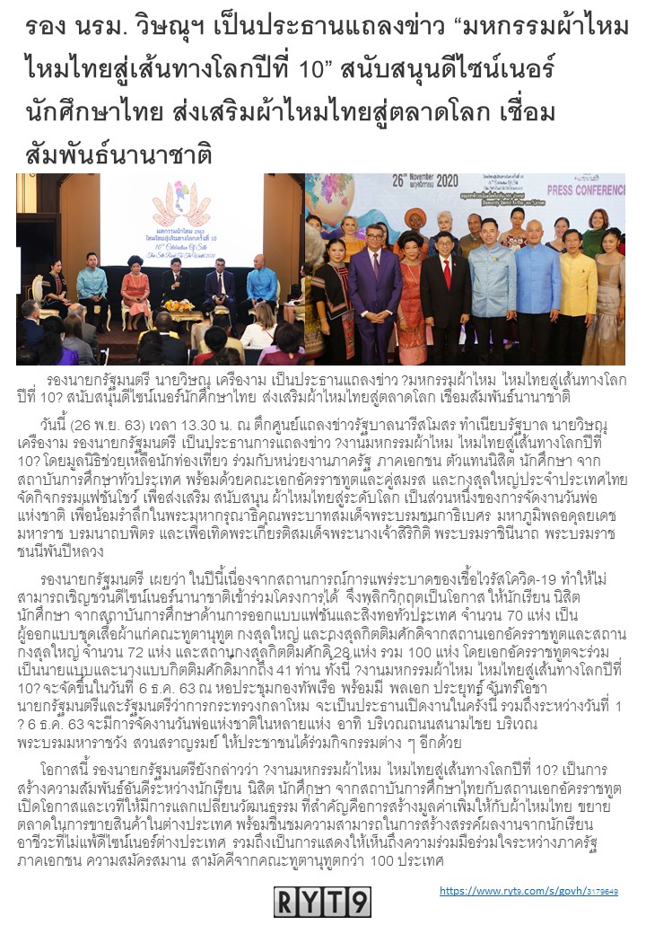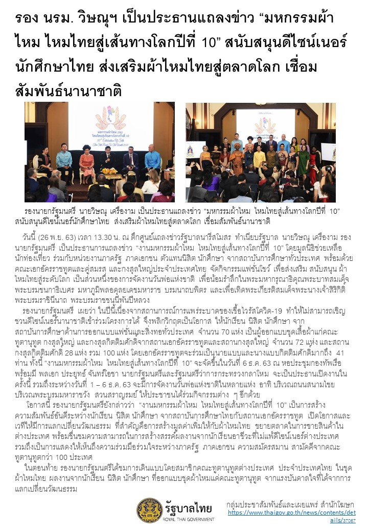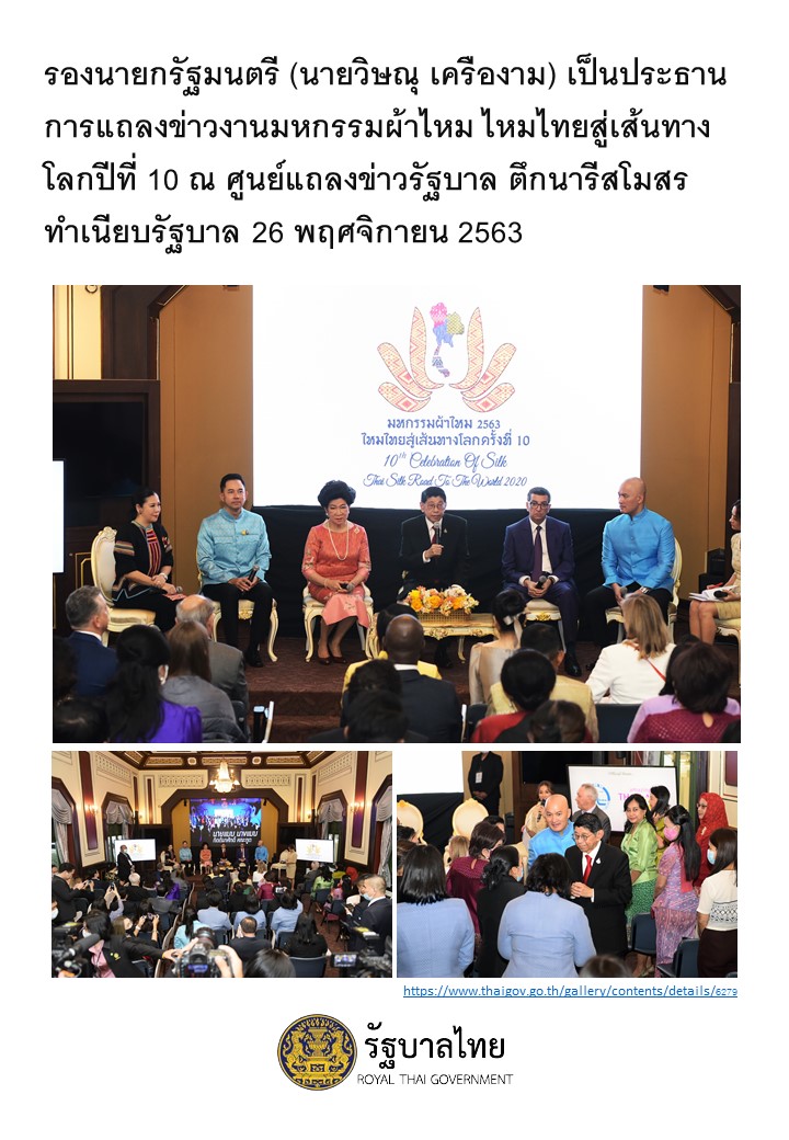 รองนายกรัฐมนตรี (นายวิษณุ เครืองาม) เป็นประธานการแถลงข่าวงานมหกรรมผ้าไหม ไหมไทยสู่เส้นทางโลกปีที่ 10 ณ ศูนย์แถลงข่าวรัฐบาล ตึกนารีสโมสร ทำเนียบรัฐบาล 26 พฤศจิกายน 2563