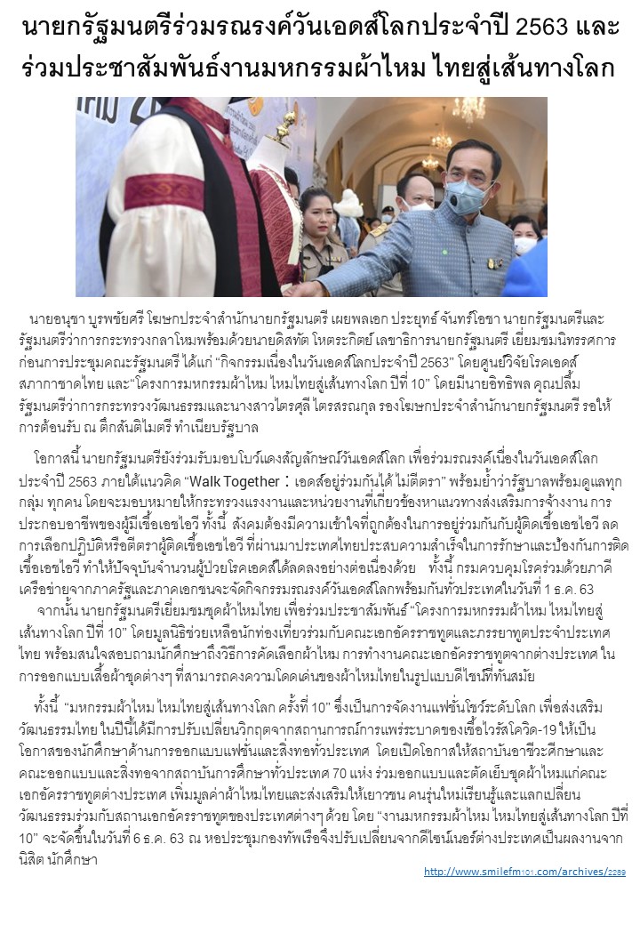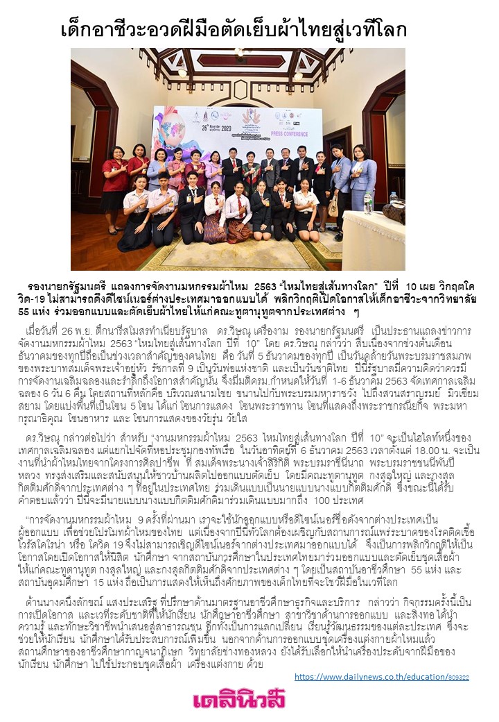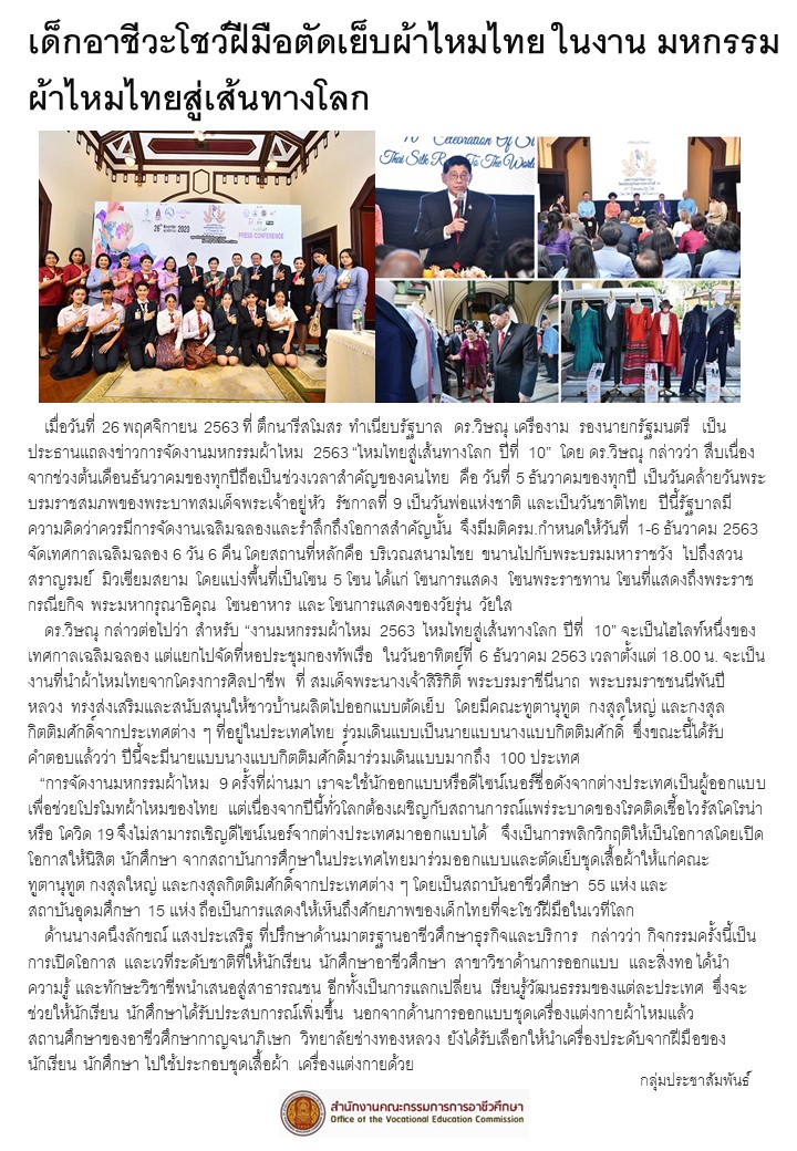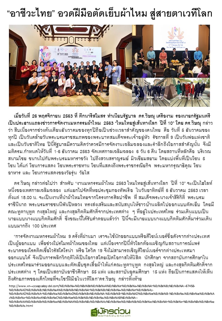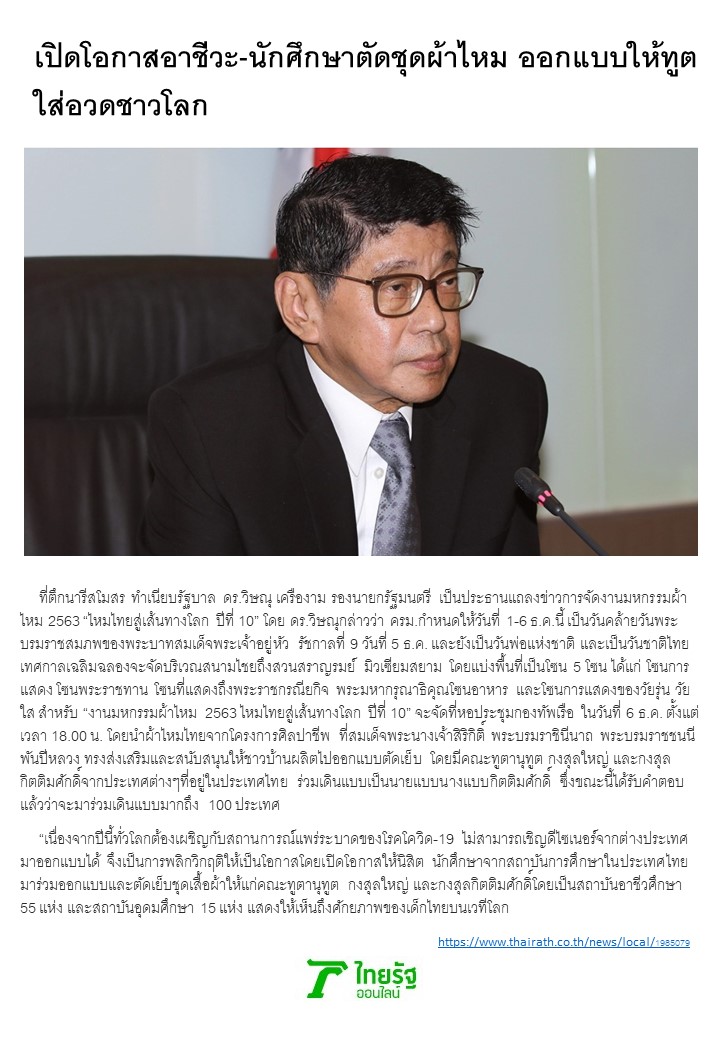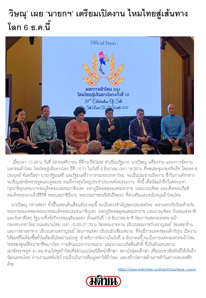 รองนายกรัฐมนตรี (นายวิษณุ เครืองาม) เป็นประธานการแถลงข่าวงานมหกรรมผ้าไหม ไหมไทยสู่เส้นทางโลกปีที่ 10 ณ ศูนย์แถลงข่าวรัฐบาล ตึกนารีสโมสร ทำเนียบรัฐบาล 26 พฤศจิกายน 2563